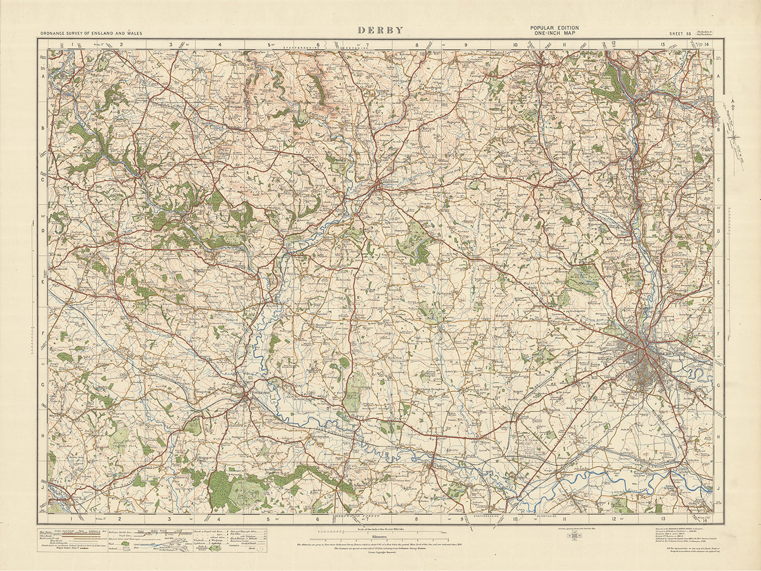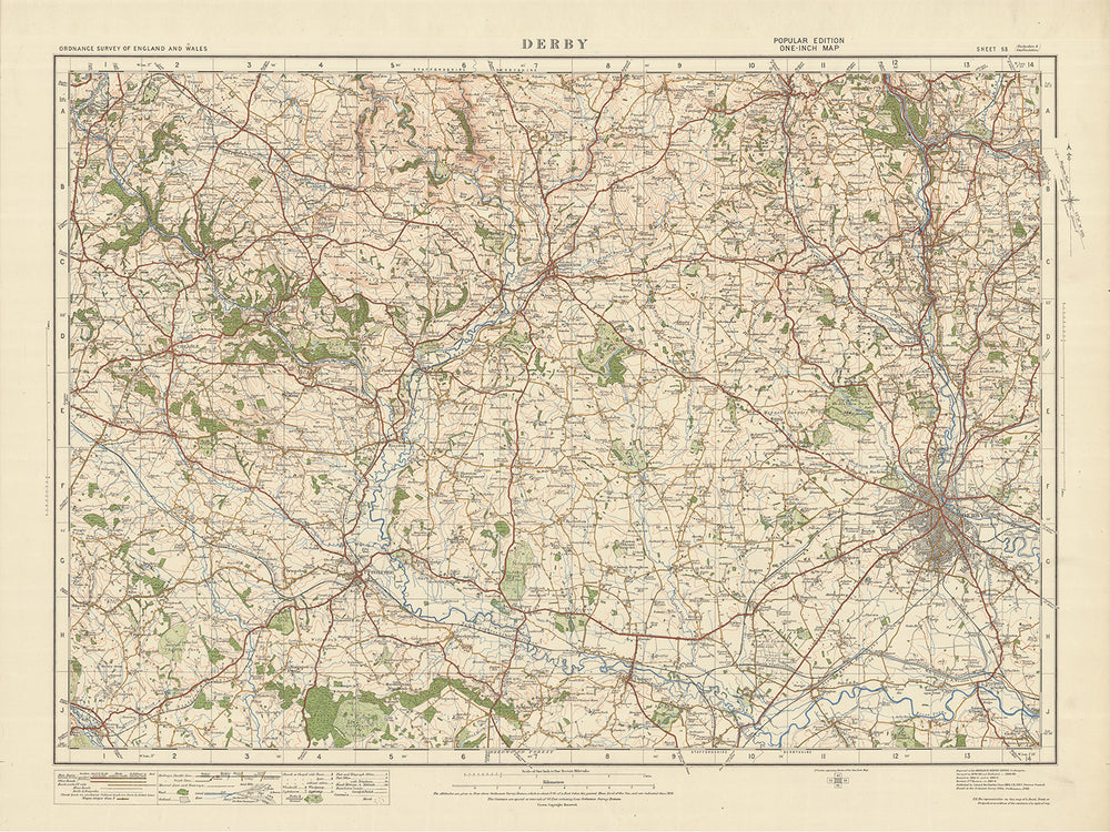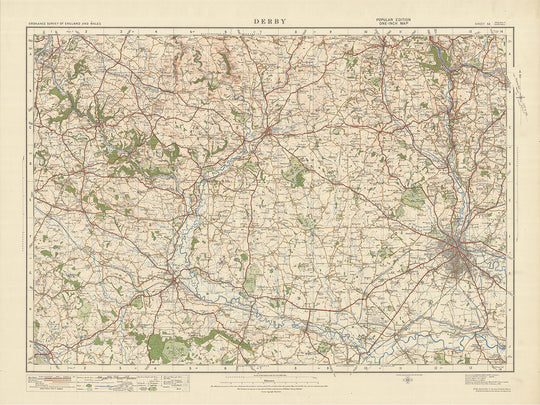 Cette carte remarquable, intitulée « Feuille 53 – Derby », fait partie de l'édition « populaire » d'un pouce de l'Ordnance Survey de l'Angleterre et du Pays de Galles, publiée en 1925. La carte présente le comté historique du Derbyshire, avec un accent particulier sur la ville. de Derby et de ses villes et caractéristiques environnantes. Il offre un aperçu fascinant du paysage, des établissements et du contexte historique de la région au début du XXe siècle.