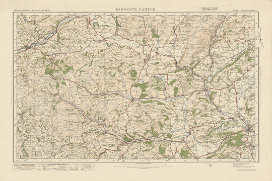 Cette carte Old Ordnance Survey, feuille 70 - Bishops Castle, 1925, offre un aperçu fascinant du paysage historique de l'Angleterre et du Pays de Galles. La carte présente plusieurs villes et caractéristiques intéressantes, notamment Newtown, Knighton, Clun, Ludlow et la région de beauté naturelle exceptionnelle des collines du Shropshire (AONB).
