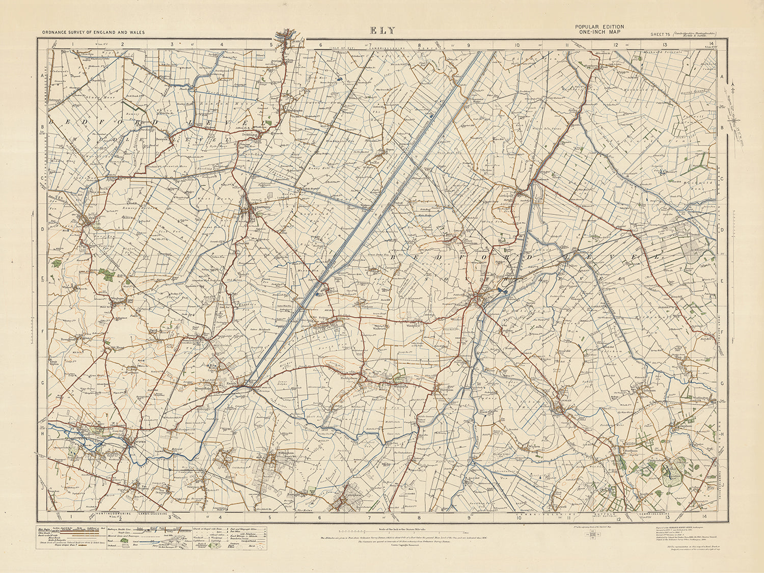 Carte Old Ordnance Survey, feuille 75: Ely, 1925 : Soham, Ramsey, St Ives, Chatteris, mars