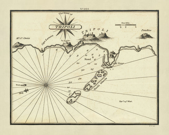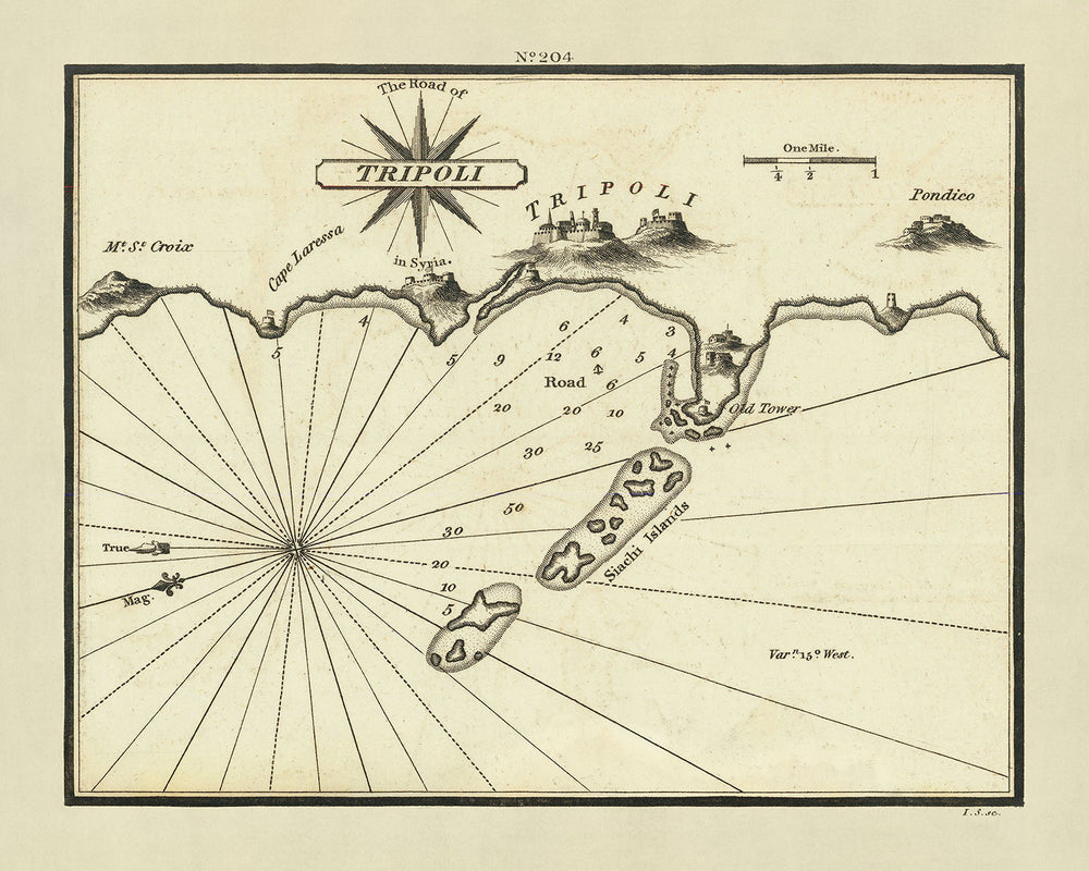 La carte de Heather est un trésor de connaissances maritimes, détaillant les sondages, les aides à la navigation et les nuances topographiques le long de la côte de Tripoli. L'inclusion de divers repères naturels et artificiels tels que les îles Shachi, l'Ancienne Tour et plusieurs fortifications, améliore son utilité et sa valeur historique. Chaque caractéristique est finement gravée, un signe de l'engagement de Heather envers la précision et la clarté dans la cartographie maritime. Cette carte a non seulement servi d'outil critique pour les navigateurs du XIXe siècle, mais elle constitue maintenant un document historique fascinant pour les collectionneurs et les chercheurs.