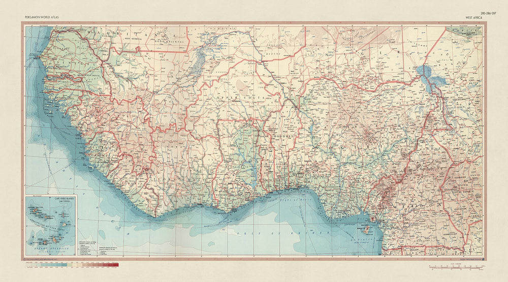 Ancienne carte de l'Afrique de l'Ouest, 1967: carte politique et physique, Bénin, Côte d'Ivoire, Cameroun, Nigeria
