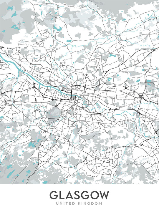 Cette carte de Glasgow est une carte de ville moderne, comportant un plan détaillé des rues sans étiquettes, parfaite pour la décoration intérieure et l'ameublement de la maison. La carte couvre une vaste zone de la ville, comprenant de nombreux quartiers, monuments et artères remarquables.