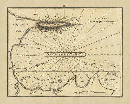 En plus de ses détails maritimes pratiques, la carte offre également un aperçu du paysage terrestre, illustrant certaines caractéristiques topographiques telles que le terrain accidenté du rocher de Gibraltar. Ce mélange d'informations terrestres et maritimes offre une vue globale de la géographie de la région, ce qui en fait une ressource inestimable pour comprendre les stratégies navales historiques et les défis naturels auxquels sont confrontés les marins de l'époque.