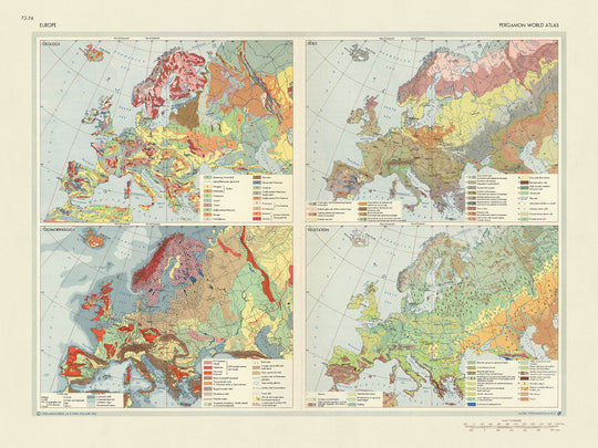 • La carte comprend quatre cartes plus petites, chacune se concentrant sur un aspect différent de la géologie, de la géomorphologie, des sols et de la végétation de l'Europe.