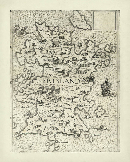 La carte de Frisland est riche en caractéristiques qui évoquent l'esprit d'aventure et de découverte. Elle comprend des illustrations de créatures marines et de navires, ajoutant une touche de fantaisie et de danger à l'océan Atlantique Nord environnant. L'île elle-même est ornée de plusieurs chaînes de montagnes, de terres agricoles organisées et de nombreux établissements, chacun étiqueté avec soin. Des points de repère notables tels qu'Andoforte, Alanto et Cabaria parsèment le paysage, fournissant un sens d'une civilisation prospère, bien que fictive. La carte présente également une carte insérée de l'île DVI, ajoutant une autre couche d'intrigue à cette pièce déjà fascinante.