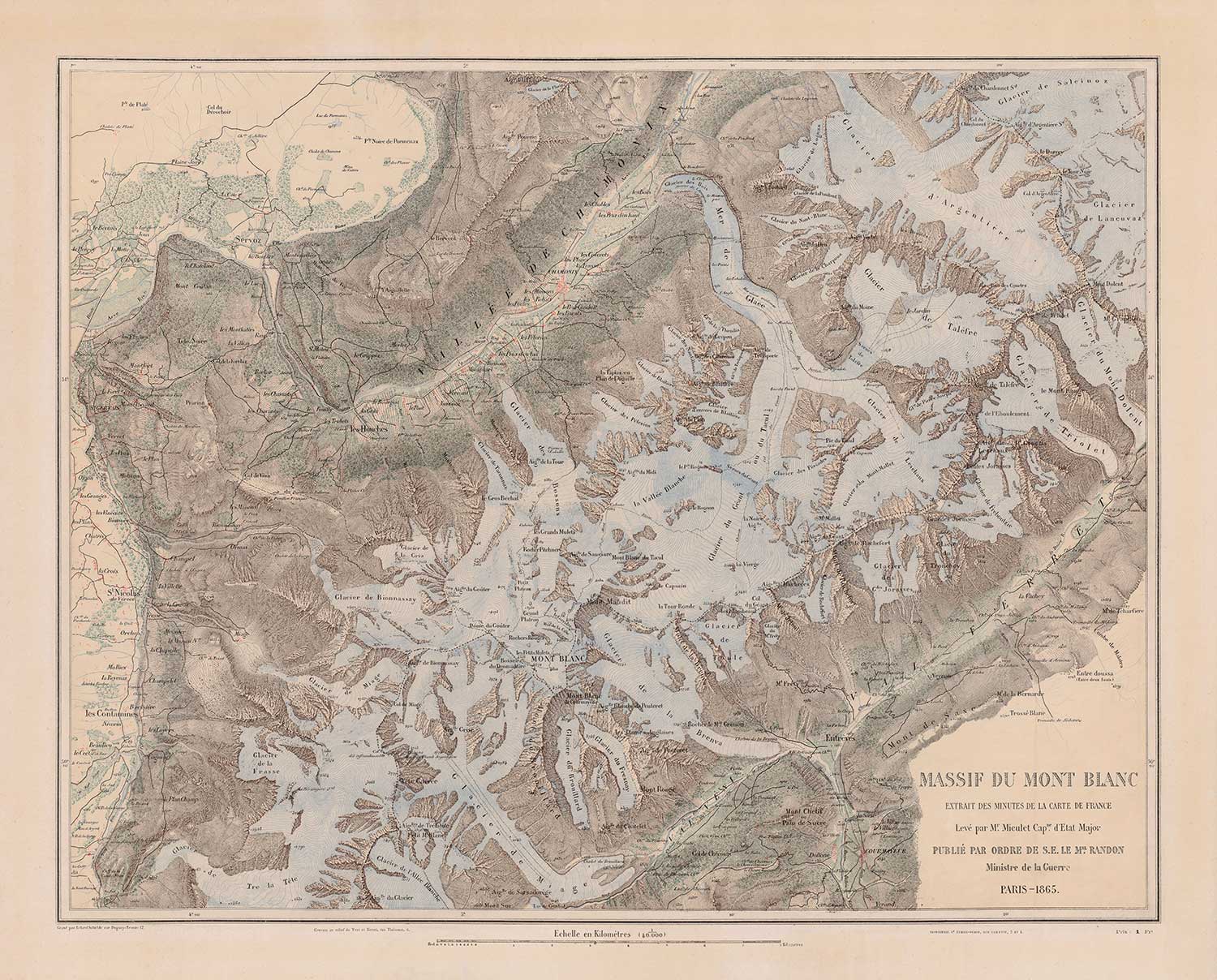 Cette carte ancienne représente le massif du Mont-Blanc, une chaîne de montagnes située dans les Alpes françaises. La carte a été créée en 1865 par Jean-Joseph Mieulet, un cartographe français. Elle montre les différents sommets, vallées et glaciers du massif du Mont-Blanc, dont le Mont-Blanc, la plus haute montagne d'Europe.