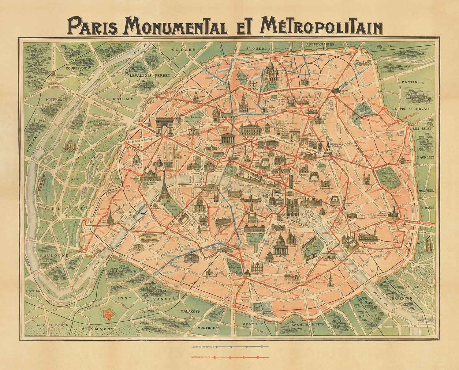 Cette carte se concentre à la fois sur les monuments et le réseau ferroviaire du Métro. En 1920, le réseau ferroviaire souterrain de Paris avait deux parties constituantes - les lignes Nord-Sud en bleu, et le Métropolitain en rouge. Le Nord-Sud a finalement été incorporé dans le métro et aujourd'hui, ce sont les lignes 12 et 13.