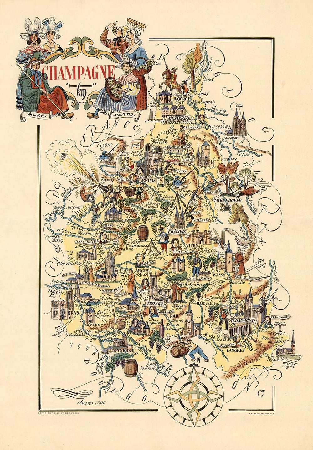 La carte de Liozu va au-delà de l'exactitude géographique pour inclure de charmantes illustrations de personnes locales, de leurs traditions et des industries qui forment l'épine dorsale de l'économie de la région. Ces illustrations offrent un aperçu de la vie quotidienne et du patrimoine culturel de la province de Champagne durant une période de renouveau et de croissance après les défis du début du XXe siècle.