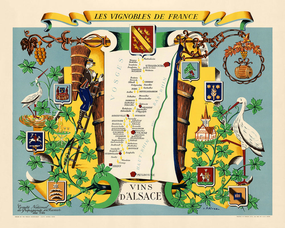 Ancienne carte des vins d'Alsace par Hetreau, 1954: Strasbourg, Colmar, régions viticoles