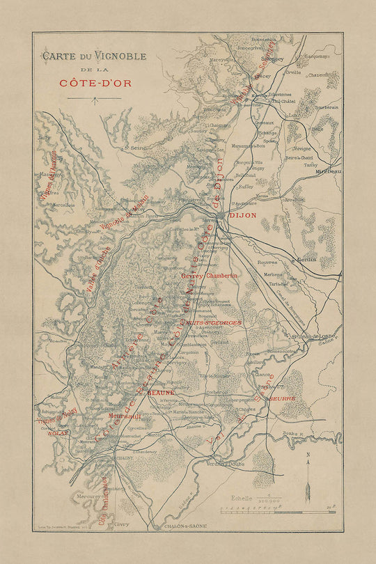Le contexte historique de la "Carte du Vignoble de la Côte d'Or" est particulièrement significatif. Créée durant une période de grands progrès en cartographie, la carte reflète l'intérêt croissant pour la cartographie agricole et économique. La Côte d'Or, avec ses vignobles chargés d'histoire et ses traditions viticoles séculaires, était un sujet naturel pour un tel travail cartographique détaillé. Cette carte donne un aperçu de la disposition et de l'étendue des vignobles à une époque où l'industrie viticole de la Bourgogne consolidait sa réputation mondiale.