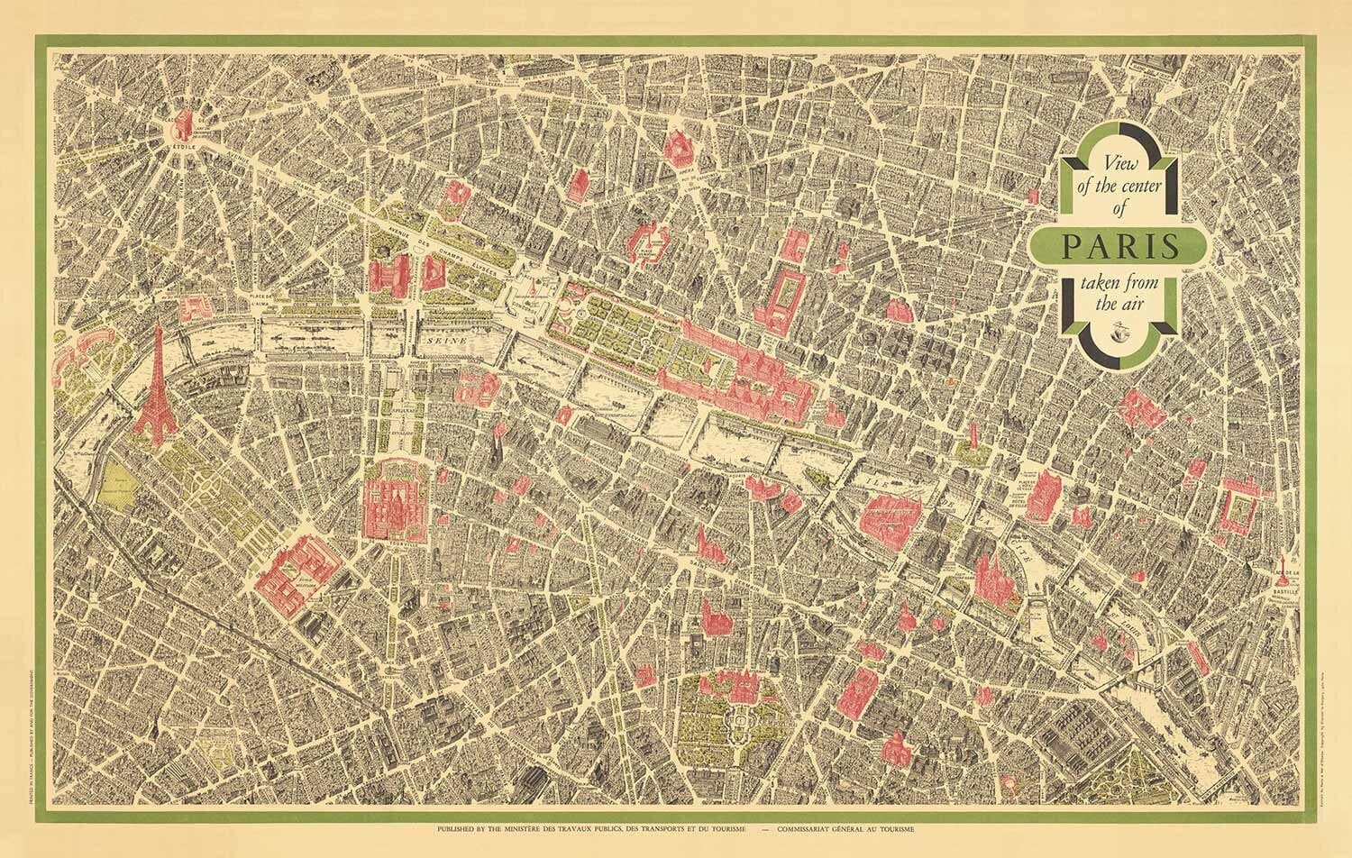 Ah, la plus belle carte jamais faite de Paris, mis en place par Georges Peltier en 1950. Il s'agit d'une carte des oiseaux-eye de Paris, ou que la carte indique, une vue sur le centre de Paris tirée de l'air ».