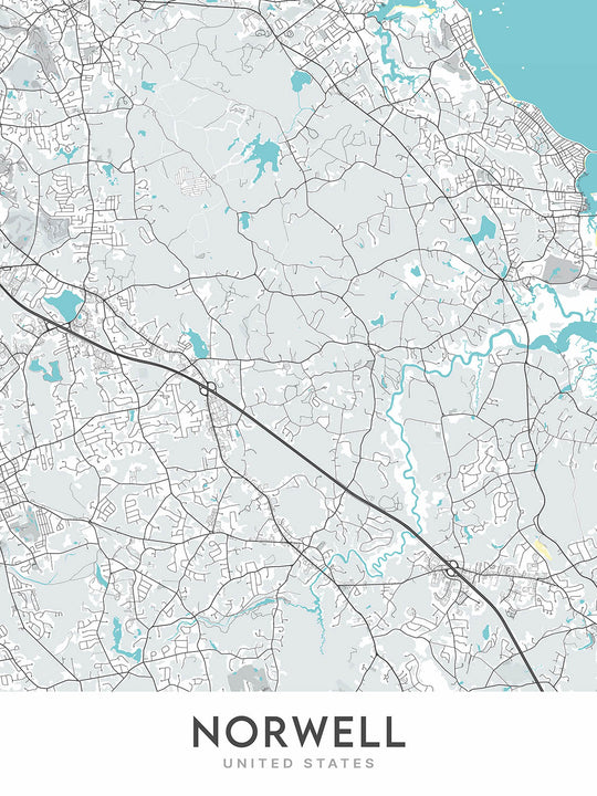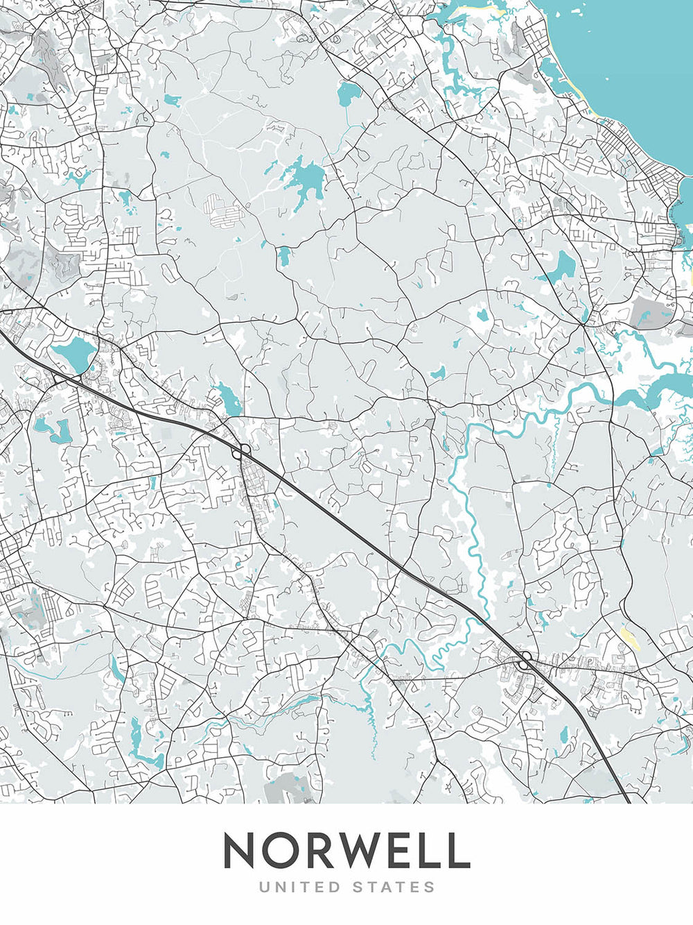 Cette création originale de The Unique Maps Co. présente une cartographie unique, un design moderne et une palette de couleurs saisissante. La carte est une belle œuvre d'art qui complètera n'importe quelle maison ou bureau. C'est un excellent sujet de conversation et un moyen idéal pour en savoir plus sur la ville de Norwell.