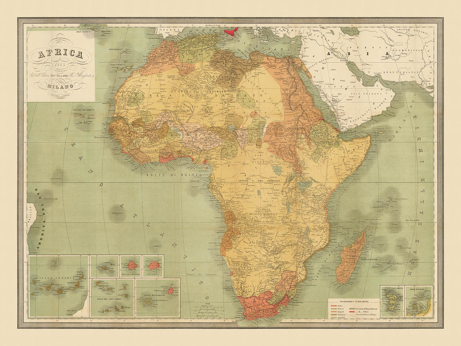 La carte présente également plusieurs cartes insets d'îles significatives, y compris les îles Canaries, le Cap-Vert et les îles Mascareignes. Ces insets offrent un aperçu plus détaillé de la géographie des îles et de leur importance stratégique durant l'ère coloniale. La présence de ces insets détaillés souligne la nature complète du travail de Vallardi, offrant une vue holistique de l'Afrique et de ses régions environnantes.