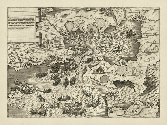 L'art de Salamanca brille à travers le design de la carte, avec des gravures méticuleuses qui illustrent la danse chaotique des navires et les caractéristiques géographiques stratégiques du golfe d'Artha. Les styles de lignes variés transmettent les profondeurs de l'eau, guidant le spectateur à travers des baies peu profondes et des eaux profondes et ouvertes. Cette attention aux détails non seulement améliore l'attrait esthétique de la carte, mais souligne également son utilité en tant qu'outil pour comprendre les manœuvres navales.
