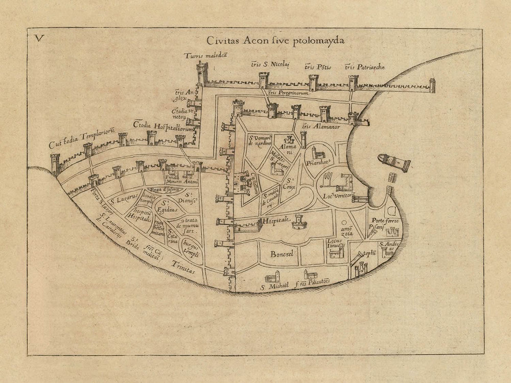 Ancienne carte d'Acre par Vesconte, 1611: Templiers, Hospitaliers, Portus Pisani, Croisades