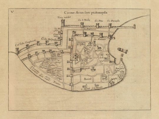 Historiquement, cette carte est inestimable, préservant la disposition d'Acre avant sa destruction par les forces arabes. Elle capture une ville à l'orée de la transformation, une enclave européenne au cœur du Levant. La présence de sites religieux tels que "S. Michael," "S. Andrea," et "S. Maria de Cuna" témoigne de l'importance spirituelle et culturelle d'Acre durant les Croisades. Cette carte ne sert pas seulement de guide géographique mais aussi de récit de l'histoire vibrante de la ville, où foi et guerre se croisaient dans la quête de contrôle sur la Terre Sainte.