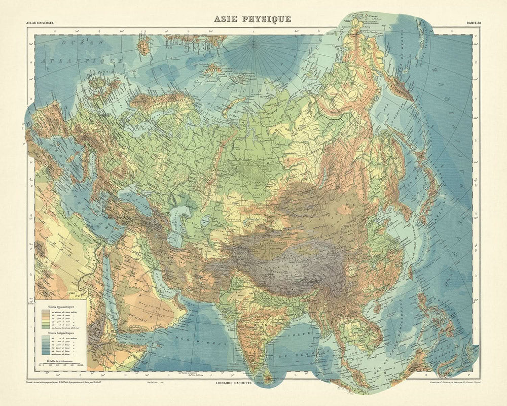 Ancienne carte physique de l'Asie par Schrader, 1931: Relief vivant, Méridien de Paris