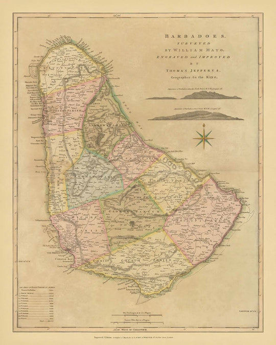 « Barbados, Surveyed by William Mayo, Engraved and Improved by Thomas Jefferys » est un aperçu captivant des Caraïbes du début du XIXe siècle. Cette carte exquise, publiée le 12 mars 1810 par Laurie & Whittle, témoigne du travail méticuleux de William Mayo, dont l'arpentage de la Barbade a établi la norme pendant près d'un siècle. La carte est une tapisserie vibrante des onze paroisses de l'île, chacune méticuleusement délimitée et colorée, offrant une représentation vivante du paysage politique de l'époque.
