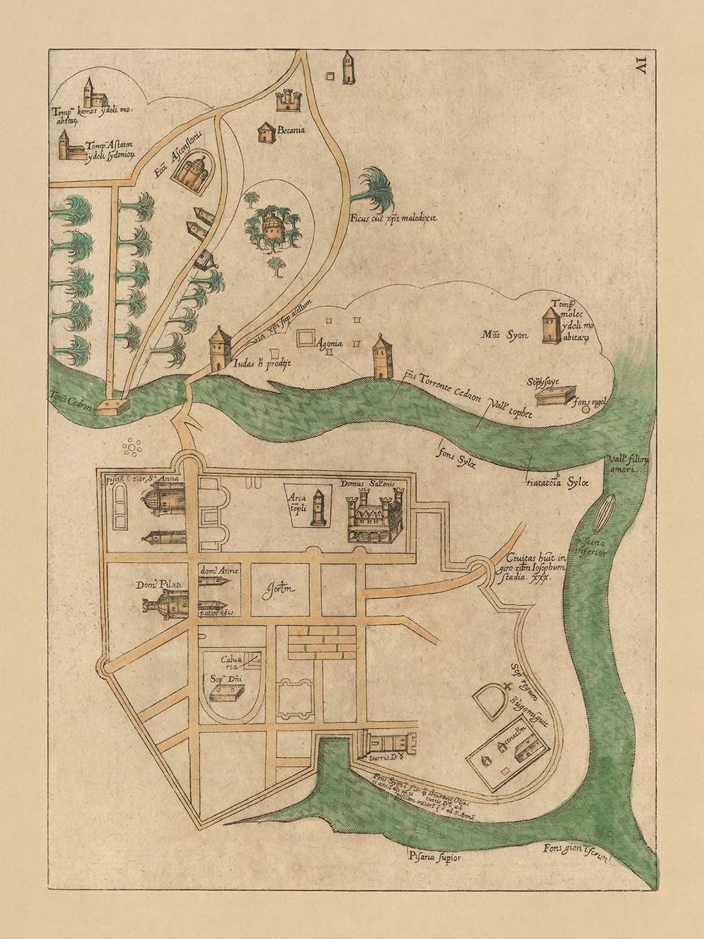 La conception de la carte reflète les sensibilités artistiques et géographiques de la période médiévale, avec sa représentation complexe de la configuration de Jérusalem. Parmi les éléments notables figurent la Domus Salomonis, la Domus Pilati et la Domus Anne, chacune représentant des récits bibliques clés. L'inclusion de l'Area Templi et du Templum Domini souligne l'importance spirituelle de la ville, tandis que la représentation du Fons Siloe et du Fons Gyon souligne l'importance des sources d'eau dans cette région aride. Ces éléments se combinent pour créer une tapisserie vivante du paysage historique et religieux de Jérusalem.
