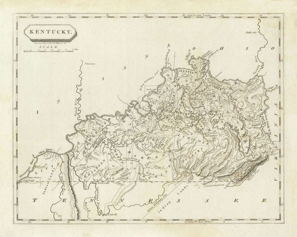 La carte présente les premières frontières politiques du Kentucky, offrant un aperçu du passé avec sa représentation des noms de comtés et des configurations. Cette carte politique et physique détaillée reflète l'identité naissante du Kentucky, mettant en évidence les divisions territoriales qui évolueraient finalement vers l'État moderne. La carte capture également les interactions complexes entre les colons et les terres amérindiennes, marquant la "Ligne de Limite Indienne" et les "Terres Indiennes" situées au sud de la frontière Kentucky-Tennessee.