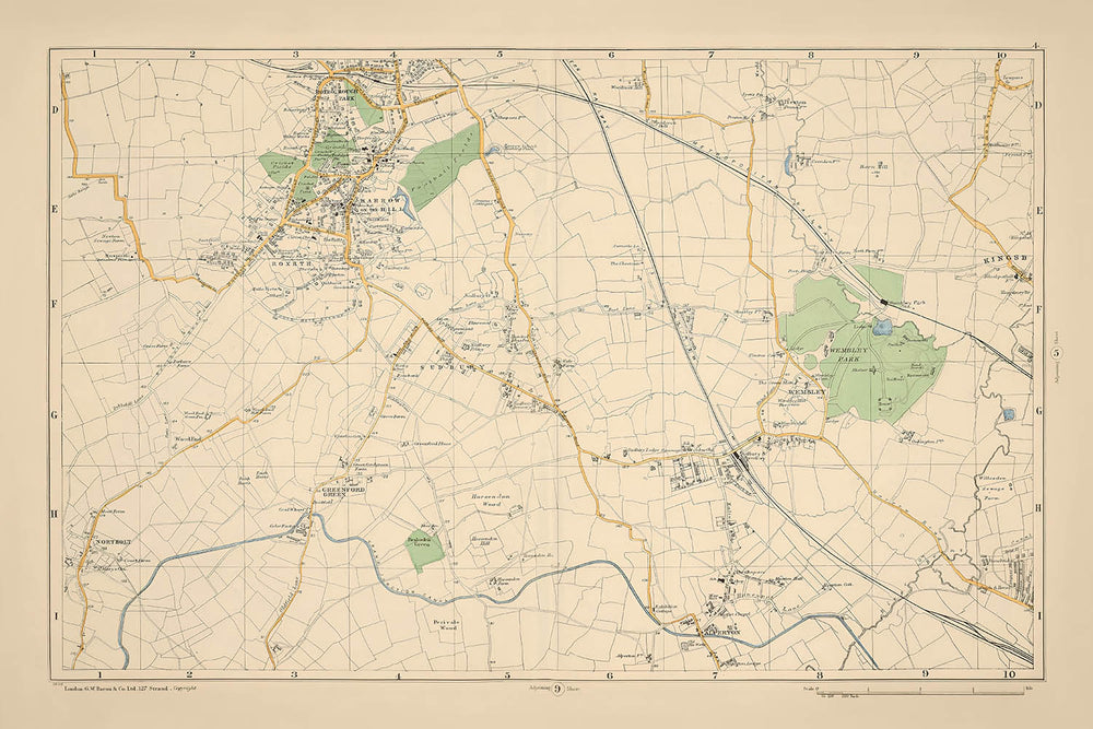 Ancienne carte du nord-ouest de Londres, 1900: Harrow, Wembley, Greenford, Alperton, Sudbury