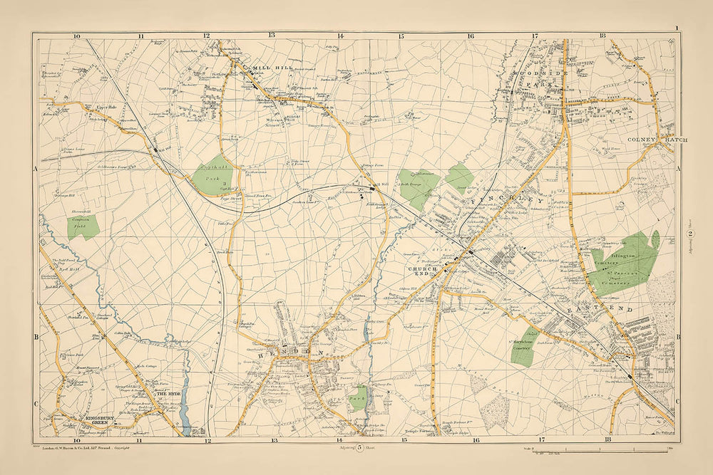 Les monuments et les éléments naturels sont représentés avec soin, notamment le paisible réservoir de Brent et les étendues luxuriantes de Bittacy Hill Park et Dollis Hill Park. Ces espaces verts offraient un répit bien nécessaire aux citadins et jouaient un rôle crucial dans la vie sociale et récréative des Londoniens. La présence de tels parcs sur la carte souligne l'importance de la nature dans l'environnement urbain, même si la ville était en pleine expansion.
