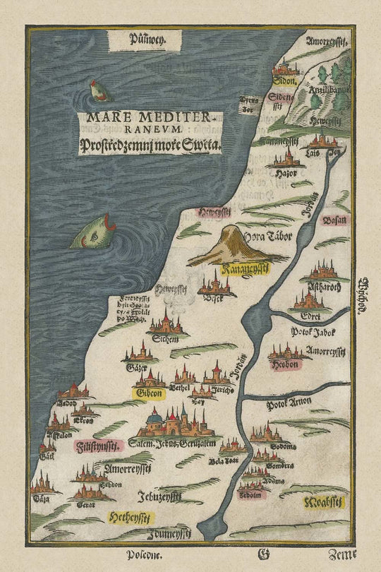 Des caractéristiques naturelles telles que le mont Tabor et la mer Méditerranée (Mare Mediterraneum) sont élégamment illustrées, ajoutant de la profondeur et du contexte à la narration de la carte. L'inclusion de ces repères géographiques met en évidence le terrain diversifié de la région, des collines ondulantes et des vallées à la mer expansive qui borde la terre. La représentation artistique des poissons dans la mer Méditerranée ajoute une touche fantaisiste, capturant l'imagination de ceux qui étudient cet artefact historique.