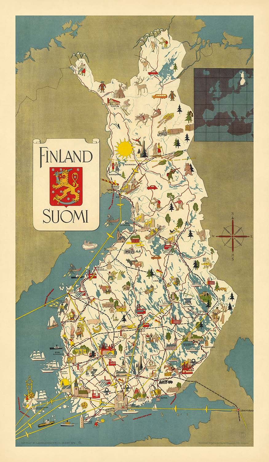 Cette carte fournit une vue d'ensemble complète de l'infrastructure de la Finlande, mettant en évidence les routes, les chemins de fer et les routes aériennes qui relient la nation. Ces éléments reflètent l'accent mis par la Finlande sur la reconstruction et la modernisation au milieu du XXe siècle. La représentation détaillée des réseaux de transport souligne non seulement l'engagement du pays envers la connectivité, mais sert également de témoignage à sa résilience et à son approche visionnaire dans l'après-guerre mondiale.