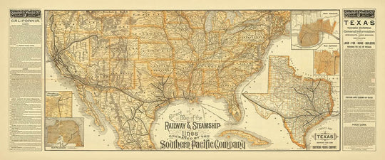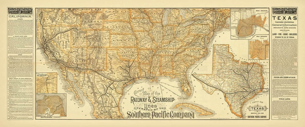 Les encarts détaillés de Los Angeles, San Francisco, San Antonio et La Nouvelle-Orléans sur la carte offrent un aperçu plus précis des principaux centres urbains de cette période de transformation. Ces encarts capturent l'essence de chaque ville, de l'effervescente Union Depot de Los Angeles aux réseaux de rues complexes de San Francisco. L'inclusion d'une carte complète du Texas souligne encore davantage l'importance stratégique de cette région dans le vaste réseau du Pacifique Sud.