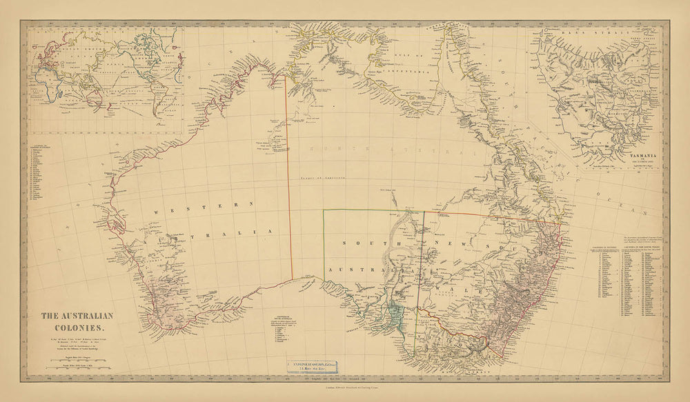 Edward Stanford, dont le nom allait bientôt devenir synonyme des meilleures cartes de l'Empire britannique, était particulièrement bien placé pour créer une telle œuvre. Son accès privilégié au Bureau colonial et à la Société géographique royale lui a permis d'incorporer les dernières informations des frontières de l'exploration et de la gouvernance. Cette carte représente la première illustration de l'Australie par Stanford, reflétant à la fois sa maîtrise technique et sa capacité à capturer le pouls géopolitique de l'époque.