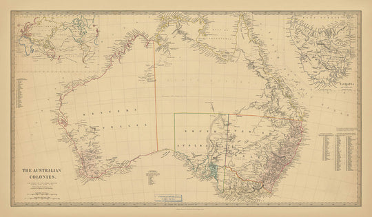 Au-delà de son intrigue politique, la carte est une célébration de la géographie dramatique de l'Australie. Elle trace méticuleusement le contour du Grand Bight Australien, les voies navigables complexes des rivières Murray et Darling, et les contours accidentés des Montagnes Bleues et des Alpes Australiennes. Les insets et la carte principale mettent en avant la Tasmanie—récemment renommée de la Terre de Van Diemen—aux côtés des îles proéminentes de Kangourou, King et Flinders, ainsi que des promontoires lointains du Cap York et de la Terre d'Arnhem. Ces caractéristiques naturelles, associées à la délimitation soignée des péninsules, des golfes et des détroits, évoquent à la fois les défis et l'attrait du continent australien.