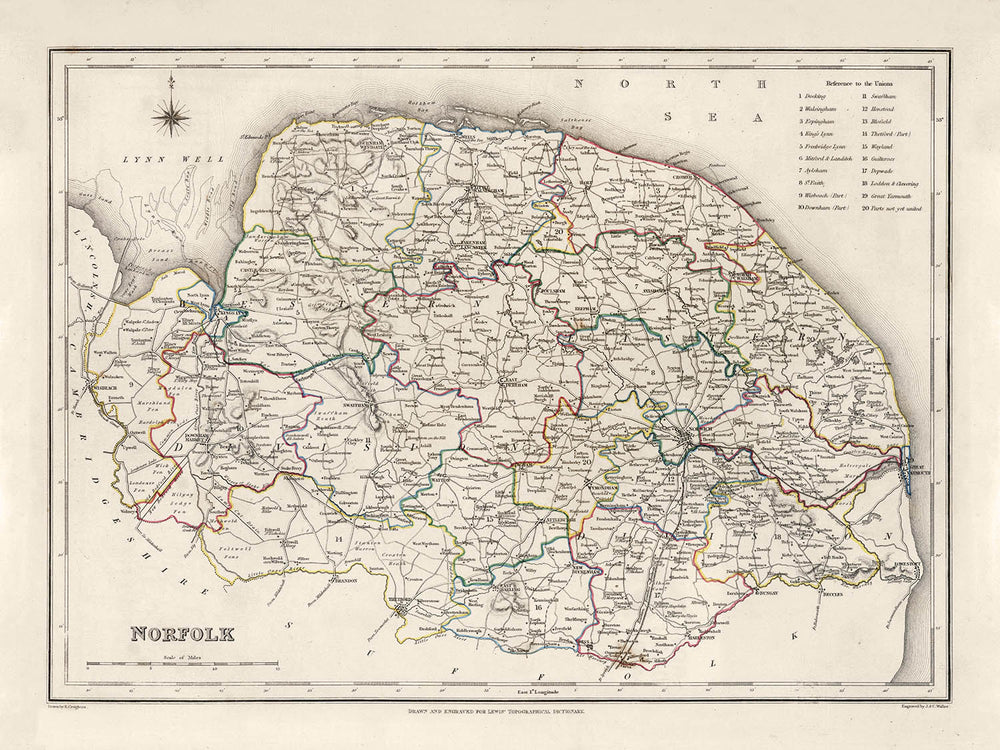 Reculez dans le temps avec cette magnifique carte, richement détaillée, du comté de Norfolk, dessinée par l'estimé Samuel Lewis en 1844. Imprégnez-vous de la beauté historique des terres orientales de l'Angleterre, avant que les vastes changements de la Révolution industrielle n'entrent en pleine force. L'attention minutieuse de Lewis aux détails nous permet d'apercevoir la forme du Norfolk telle qu'elle était il y a plus d'un siècle et demi, racontant l'histoire de sa riche narration historique. Certaines villes modernes peuvent ne pas figurer sur cette carte, ou vous pourriez les trouver portant un nom antérieur, vous offrant ainsi une perspective unique sur le passé de ces établissements.