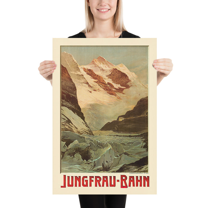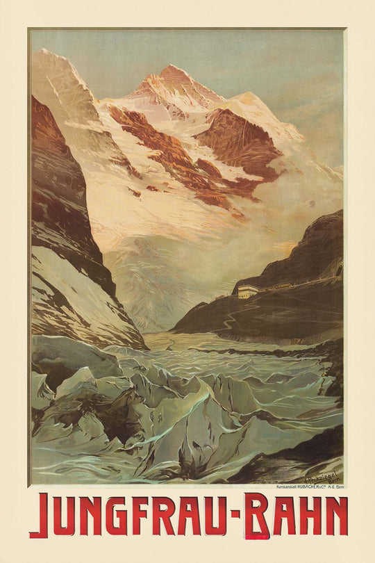 Jungfrau-Bahn by Anton Reckziegel (1910) is a quintessential Swiss Art Nouveau travel poster celebrating the high Alpine drama of the Bernese Oberland. Created at the height of the Golden Age of travel, this design invites viewers toward the glaciated flanks of the Jungfrau massif—an emblem of Switzerland’s romanticized mountain world and the promise of effortless ascent by rail. Reckziegel channels Jugendstil elegance into a sweeping panorama of peaks and valleys, a work that helped define how Switzerland presented its landscapes to the world.