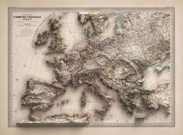 À première vue, la carte attire l'attention sur l'étendue de l'Empire français, couvrant non seulement la France, mais également certaines parties de l'Italie, de l'Espagne et même des îles britanniques. Pourtant, une inspection plus approfondie révèle une image plus complète de l’Europe, englobant d’autres régions importantes telles que l’Irlande, le Portugal, l’Allemagne, la Belgique, la Suisse, l’Autriche, la Pologne, la Russie, l’Ukraine et les Pays-Bas. Chaque pays est marqué avec une précision méticuleuse, démontrant l'engagement de Dyonnet envers l'exactitude et le détail.