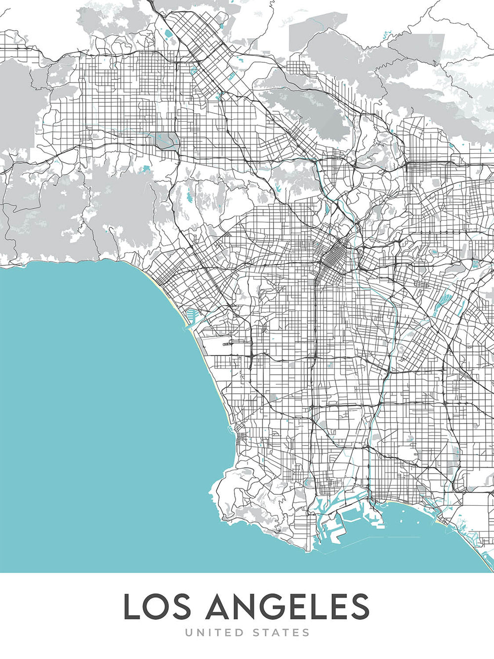 Cette carte de Los Angeles, créée par The Unique Maps Co. en 2024, est une carte des rues moderne et détaillée sans étiquettes. Cette carte se concentre sur la ville de Los Angeles et ses environs dans une zone géographique rectangulaire mesurant environ 66 miles de haut en bas et 56 miles de gauche à droite.