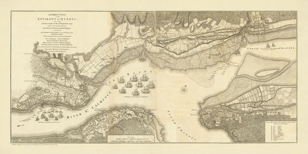 Ancienne carte de la bataille de Québec par Jefferys, 1759: Plaines d'Abraham, rivière Saint-Laurent, troupes françaises et britanniques, artillerie, divisions navales