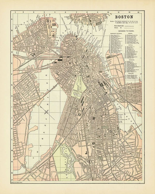 Ancienne carte de Boston par Fisk & Co., 1893: les terrains publics, le jardin public, les Fens, la rivière Charles, le parc Franklin