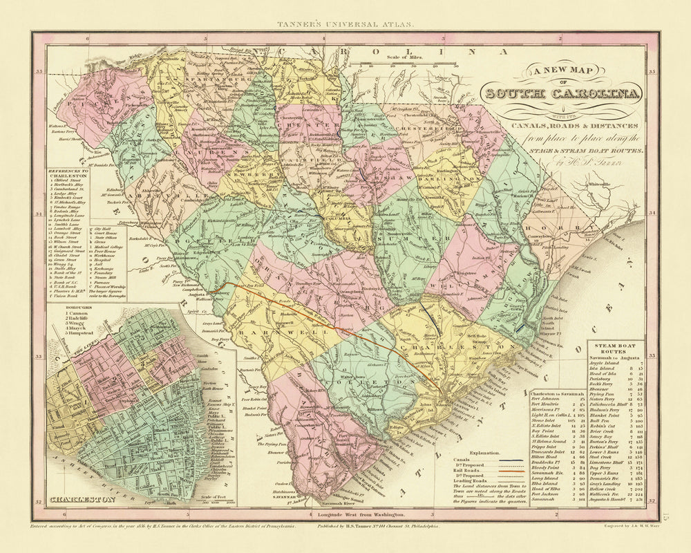 Ancienne carte de la Caroline du Sud par Tanner, 1836 : Charleston, Columbia, Camden, Georgetown et Beaufort