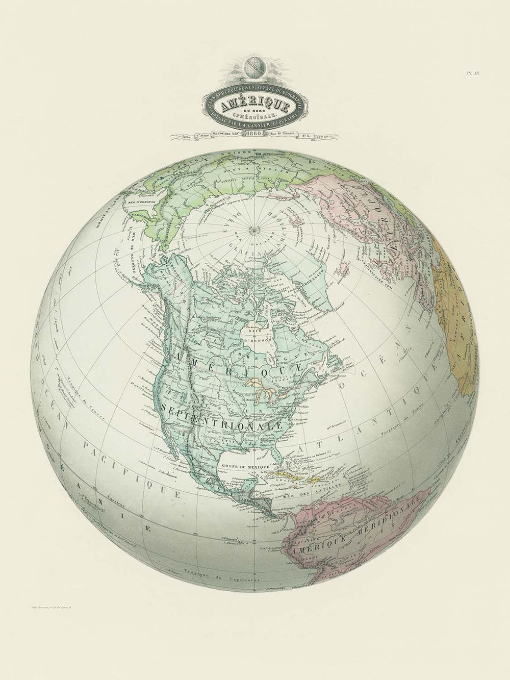Ancienne carte sphérique de l'Amérique du Nord par Garnier, 1860