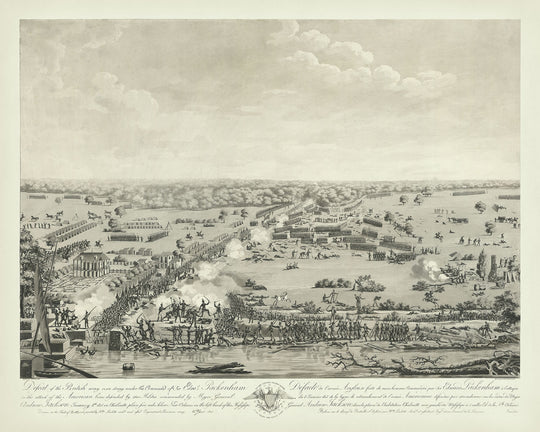 "[L]a représentation de Laclotte comme fiable et d'une telle autorité en a fait la vue de bataille la plus copiée," note Cook. La gravure présente à la fois des titres en français et en anglais, élégamment séparés par un aigle américain et l'inscription "À la gloire des États-Unis." Le panorama ambitieux et expansif offre une vue aérienne de l'escarmouche sur la rive est du Mississippi pendant son intensité maximale. L'artillerie américaine robuste, les troupes britanniques chargées armées d'échelles, et même un duel au sabre animé sont méticuleusement illustrés.