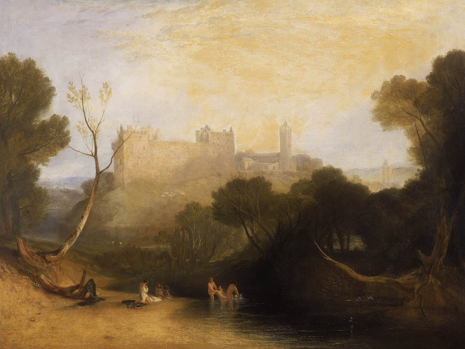 Le palais de Linlithgow est particulièrement notable parmi la série écossaise de Turner ; il dépeint magistralement les ruines majestueuses au milieu de larges étendues de jaune et de vert, capturant un sentiment de nostalgie et de renouveau teinté par l'éclat vibrant du crépuscule ou de l'aube. Cette peinture se distingue par la façon dont elle enveloppe la silhouette évocatrice du palais dans la lumière dorée du soleil, imprégnée de douces prairies vertes et de tons terreux bruns délicats. Les transitions subtiles entre les couleurs créent une scène presque onirique, mélangeant révérence historique avec idéalisme romantique et émotion poignante—des caractéristiques de l'œuvre mature de Turner.