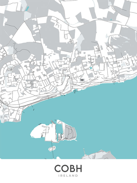 Cette carte de Cobh, en Irlande, est un plan de rue moderne et détaillé sans étiquettes, se concentrant sur la ville et ses environs. La carte couvre une zone rectangulaire d’environ 2,88 milles sur 2,42 milles, avec la ville de Cobh en son centre. La carte est une création originale de The Unique Maps Co., présentant une cartographie unique, un design moderne et des coloris uniques qui complèteront n'importe quelle maison ou bureau.