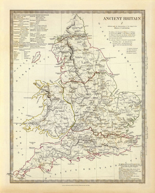 Une carte fantastiquement intéressante montrant la division de l'Empire romain en Angleterre et au Pays de Galles, ou l'Ancienne Bretagne comme l'appelle la carte, ainsi que les anciennes tribus celtiques qui habitaient les îles britanniques avant la conquête romaine. La carte a été publiée à l'origine par la Société pour la Diffusion du Savoir (SDUK) en 1834.