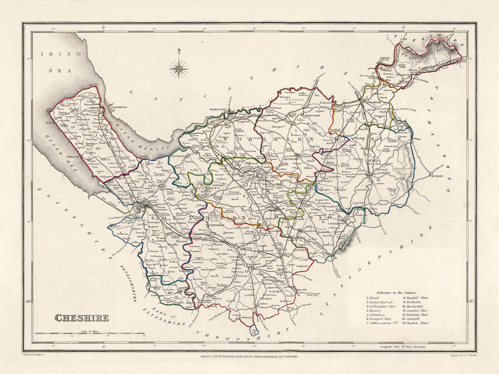 Ancienne carte du Cheshire par Samuel Lewis, 1844: Warrington, Stockport, Chester, Macclesfield et Crewe