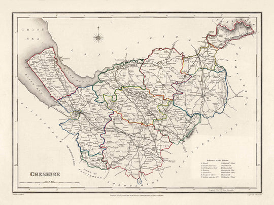 Cette carte du comté de Cheshire est un véritable reflet de la topographie et des schémas d'établissement du 19ème siècle. Chaque détail minutieux, des frontières magnifiquement rendues aux rivières placées avec précision, dévoile une fascinante narration du passé, vous ramenant à une époque où la Révolution industrielle redessinait le pays. Avec les événements historiques de 1800 à 1850 tels que l'ouverture du viaduc de Stockport en 1840, la fondation de la gare de Chester en 1848 et le boom de l'exploitation du sel, cette carte est plus qu'une représentation cartographique, c'est l'histoire du parcours historique de Cheshire.