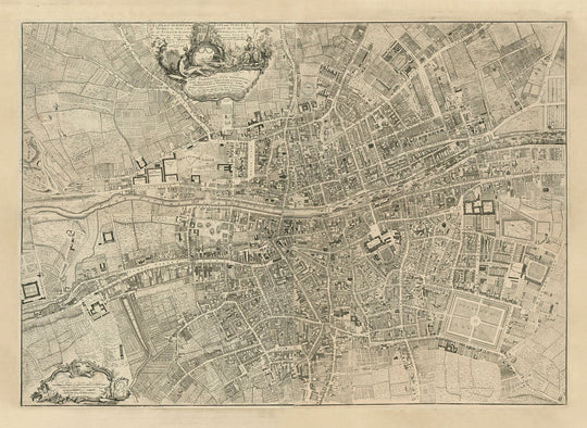 Cette vieille carte de Dublin, créée par le maître géomètre et cartographe John Rocque en 1756, montre l'intégralité de Dublin et de ses banlieues. En effet, le nom original de cette carte était : Un relevé exact de la ville et des banlieues de Dublin 1756, dans lequel est exprimé le plan de toutes les constructions publiques, maisons d'habitation, entrepôts, écuries, cours, etc.,