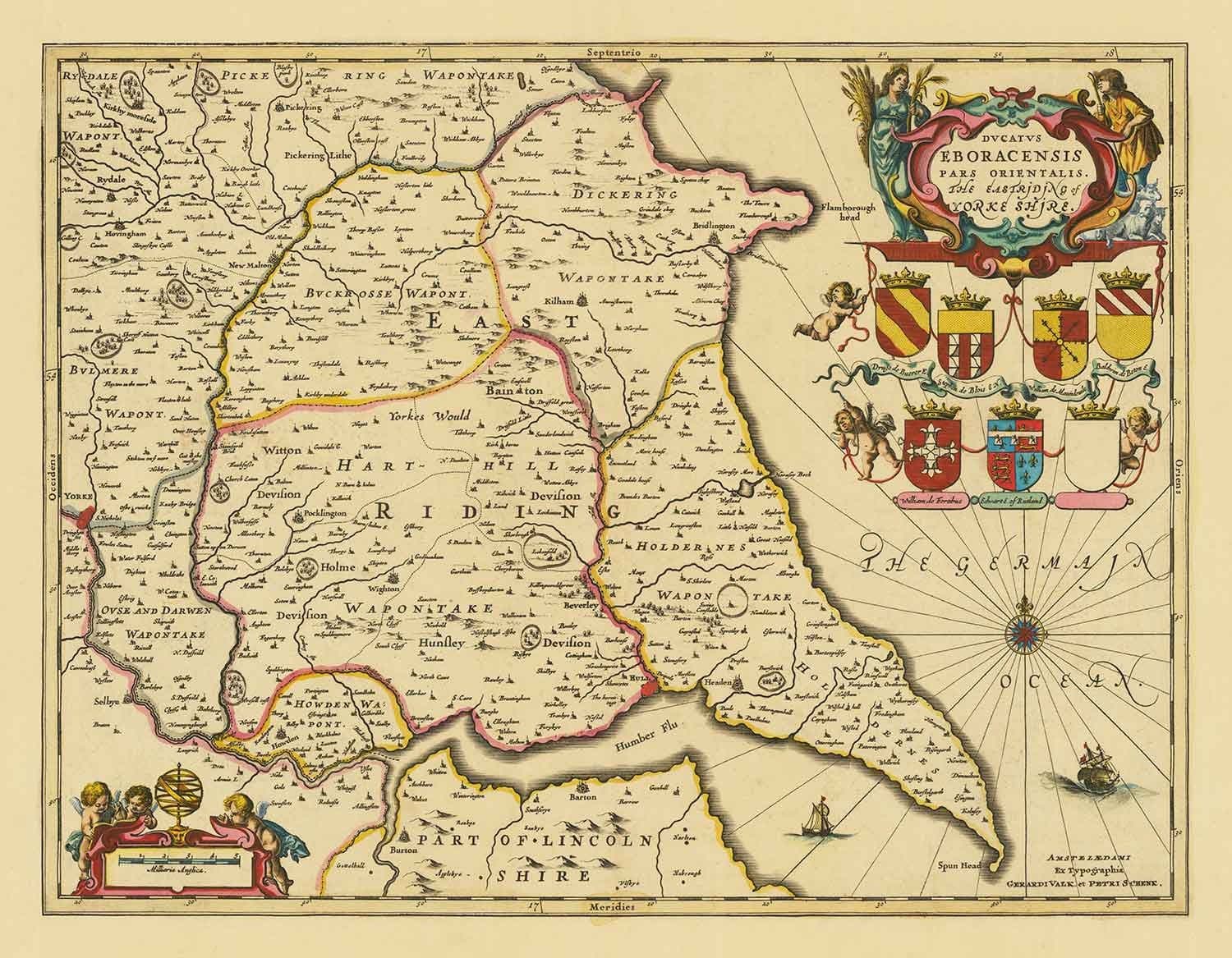 Cette carte délicieusement colorée à la main, détaillée et extrêmement rare de l'East Riding of Yorkshire (aujourd'hui simplement East Yorkshire) a été publiée à l'origine en 1690 par Valk & Schenk, un duo de maîtres cartographes qui travaillait à Amsterdam au XVIIe siècle.
