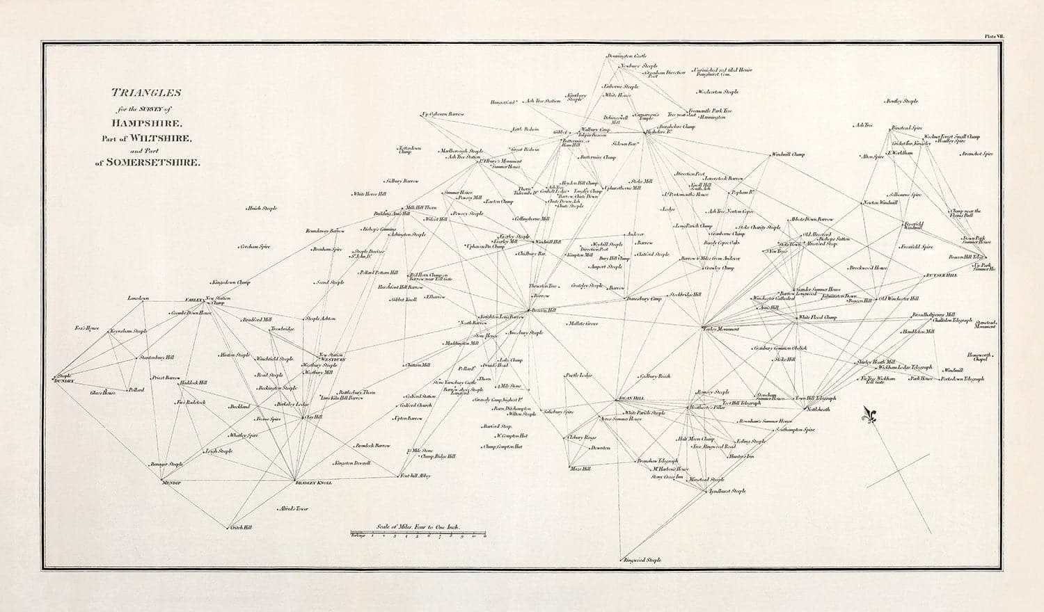 C'est littéralement une carte des triangles - mais ce sont des triangles très importants. Ils sont des triangles très précis entre divers points de Hampshire, mesurés à l'aide de théodolites.