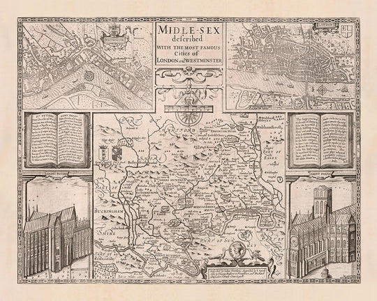 Ancienne carte du Middlesex par John Speed, 1676 : Londres, Westminster, Highgate, Harrow, Brentford et Uxbridge