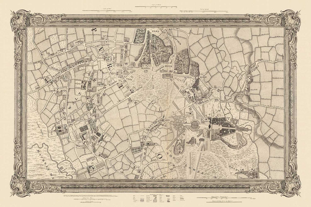 Publié il y a presque 300 ans par le maître cartographe John Rocque, voici la première carte détaillée du Nord-Est de Londres. Elle a été publiée à l'origine en 1746, suite à une enquête très précise sur Londres et ses banlieues débutant en 1740. C'est une belle carte ancienne, très détaillée et extrêmement rare.